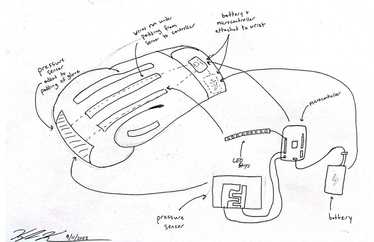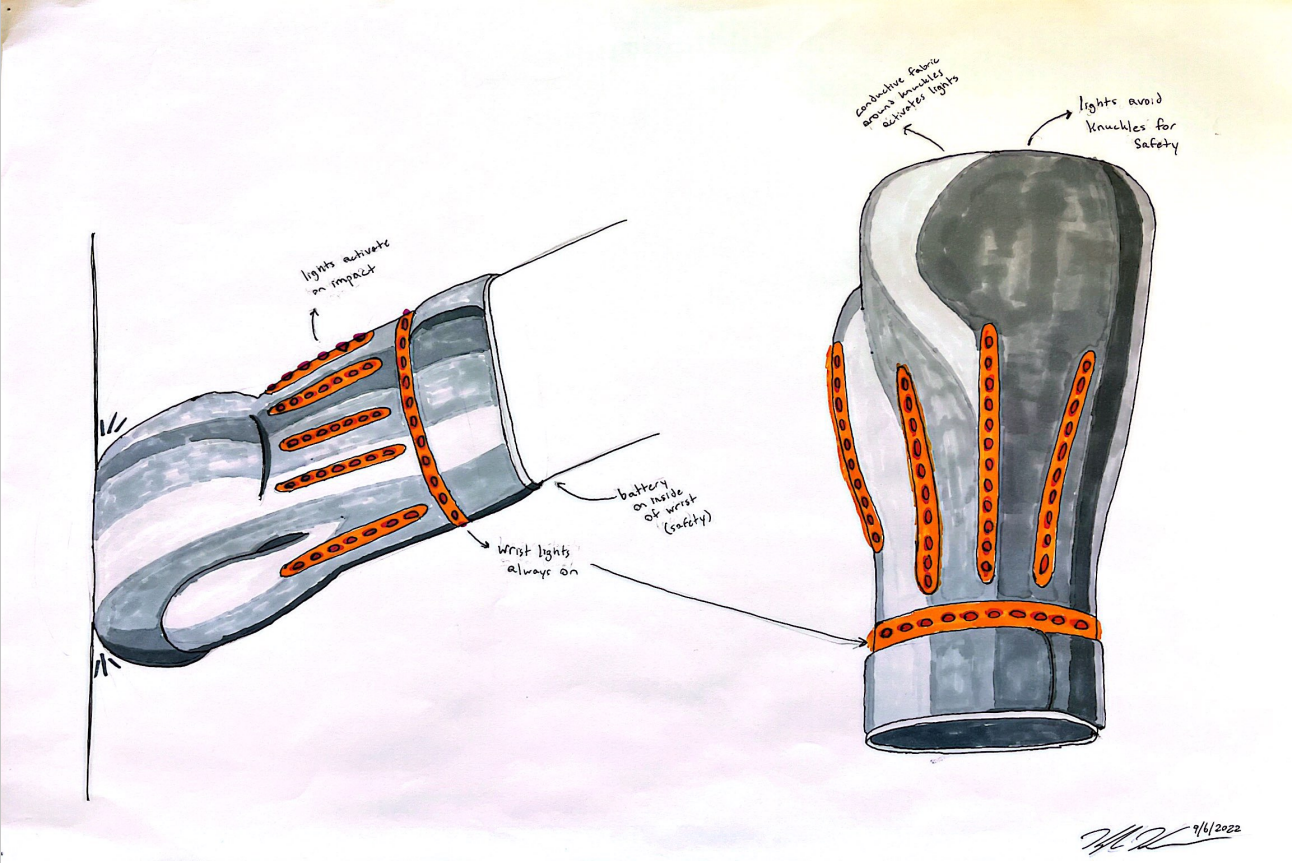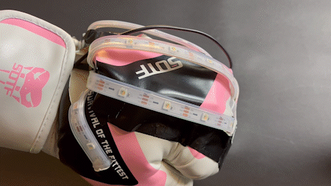 A sensor is hidden in the knuckles of the glove to track impacts, with the microcontroller and battery stored down by the wrist for safety reasons. LED lights are embedded in the padding to allow for maximum durability and visibility.